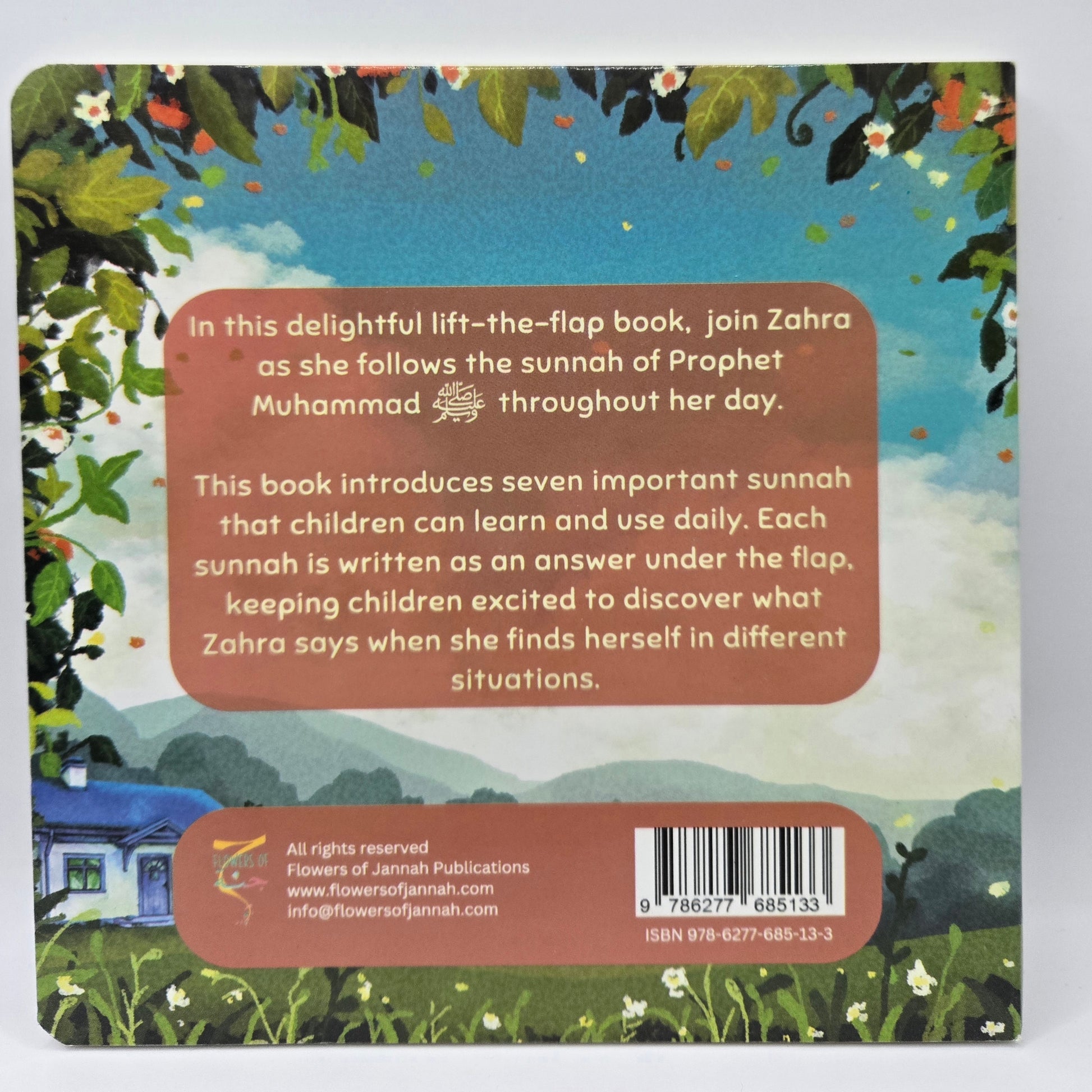 Join Zahra in a fun-filled day as she practices the Sunnah of Prophet Muhammad ﷺ in simple, relatable scenarios. In each spread, children will lift a flap to reveal Sunnah actions that Zahra follows — making the learning experience engaging and interactive. There are seven key Sunnah practices featured throughout, encouraging little ones to explore and learn in a playful way.