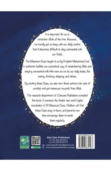 This book contains the Arabic text and English translation of 18 Masnoon Duas. Children will find these Duas easy to learn, and parents can then encourage them to recite them regularly